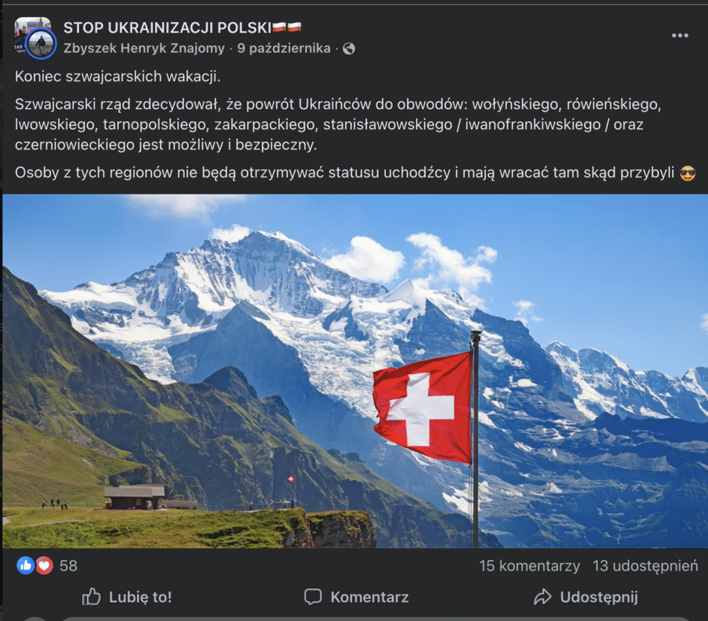 W mediach społecznościowych pojawiły się wpisy sugerujące, że Szwajcaria kończy “szwajcarskie wakacje” i zamierza odsyłać Ukraińców z kilku zachodnich obwodów z powrotem do kraju. W postach można przeczytać, że osoby te “nie będą już otrzymywać statusu uchodźcy i mają wracać tam skąd przybyli”.